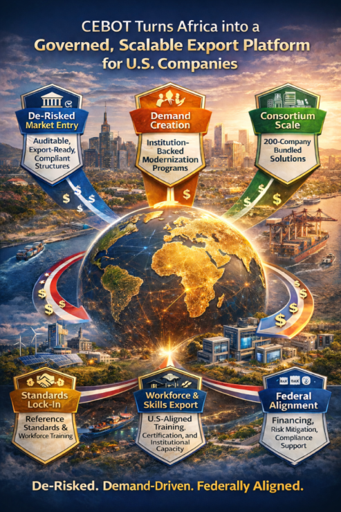 CEBOT restructures that equation. By aggregating demand, governing execution, and anchoring deployments in institutions, workforce systems, and compliant financing structures, CEBOT converts complex African markets into scalable, executable export platforms for U.S. companies.