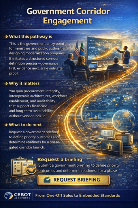 This is how CEBOT converts Africa from a high-friction market into a governed export platform: faster qualification, cleaner procurement readiness, stronger auditability, and a more bankable path to nation-scale deployment.