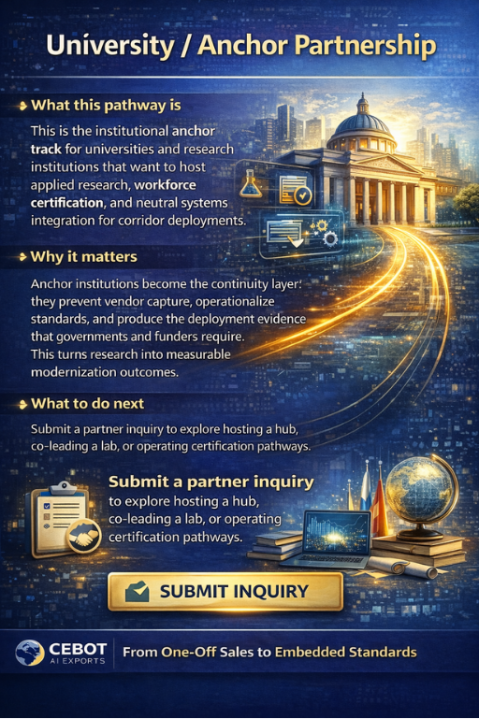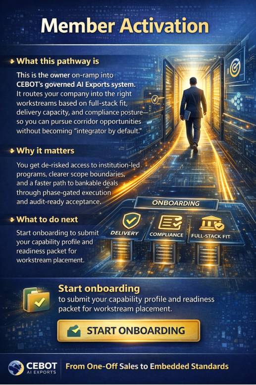 The links above are critical to CEBOT's Standards and Adoption Strategy. They represent how the Trust Layer of the CEBOT AI exports system works. These three functions, Member Activation, University / Anchor Partnerships, and Government Corridor Engagement establishes proof, clarify how the system works, and route you into the correct governed pathway.