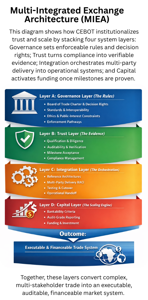 CEBOT transforms Africa from a high-friction market into a governed operating environment where U.S. capabilities can scale with confidence. Instead of each company navigating opaque procurement, institutional uncertainty, and uneven compliance conditions alone, CEBOT structures institution-led corridors with defined decision rights, auditability, and enforceable controls. That governance reduces sovereign and operational risk, strengthens procurement integrity, and creates clear acceptance criteria—so projects don’t stall in dispute or ambiguity. Once performance is proven through verified milestones, the program becomes bankable, enabling capital partners to engage with far lower uncertainty. The result is a scalable export platform where growth is driven by evidence and governance—not speculation.